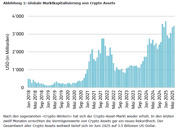 Der Markt für Vermögenswerte auf der Blockchain (Crypto Assets) hat im vergangenen Jahr deutlich an Fahrt aufgenommen. Mitte 2025 belief sich der Gesamtwert aller Crypto Assets weltweit auf rund 3.5 Billionen US-Dollar (Abbildung 1). Dies zeigt die neueste «Crypto Assets Study 2025» der Hochschule Luzern (HSLU). Auch in der Schweiz und im Fürstentum Liechtenstein entwickelte sich der Markt dynamisch: Das verwaltete Vermögen in indirekten Anlageprodukten wie Fonds oder börsengehandelten Produkten wuchs bis Juni 2025 auf rund 15 Milliarden Franken. Damit ist das Volumen innert zwölf Monaten um rund zwei Drittel gestiegen.