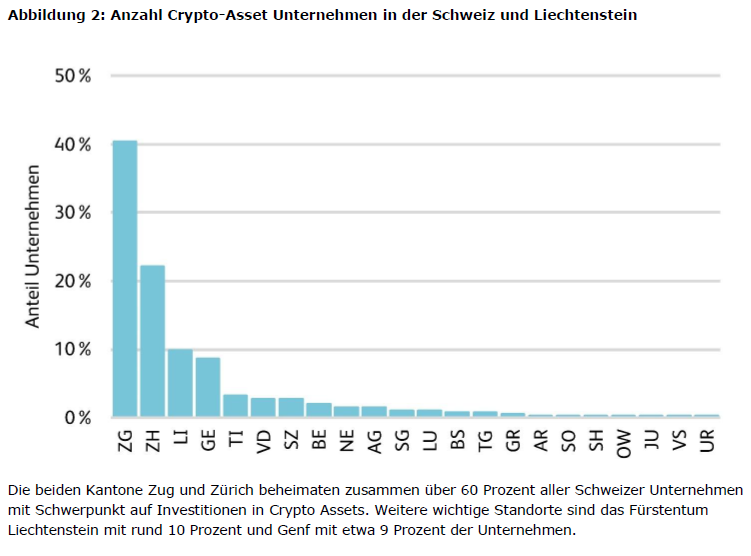 Dieses Wachstum zeigt sich auch bei der Anzahl Unternehmen in der Schweiz und Lichtenstein, die Crypto-Asset-Dienstleistungen anbieten. Waren es vor einem Jahr noch 359 Unternehmen, sind es Mitte 2025 insgesamt 407 (Abbildung 2). Dies entspricht einem Wachstum von über 13 Prozent. Dabei konzentriert sich der Markt für Crypto Assets nach wie vor auf die Kantone Zug und Zürich: Über 60 Prozent der Unternehmen aus dem Crypto-Asset-Bereich sind in diesen beiden Kantonen angesiedelt.