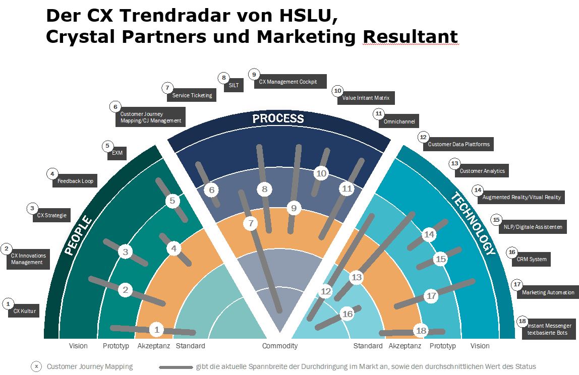Im CEX Trandradar von der HSLU, Crystal Partners und Marketing Resultant werden die wichtigsten Technologien und Instrumente nach ihrer aktuellen Relevanz für das Customer Experience Management priorisiert.