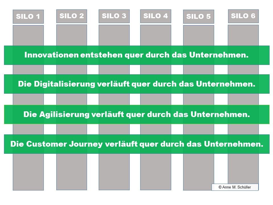 Natürlich werden auch Menschen gebraucht, die als Stimme der Kunden im Unternehmen agieren und die interdisziplinäre Zusammenarbeit im Interesse der Kunden harmonisieren. Wenn sich in der Aussenwelt alles vernetzt, muss das auch drinnen im Unternehmen passieren. Doch Silostrukturen verhindern dies oft. Die Hauptaktionsrichtung in Silos verläuft ja vertikal, also top-down und wieder zurück.