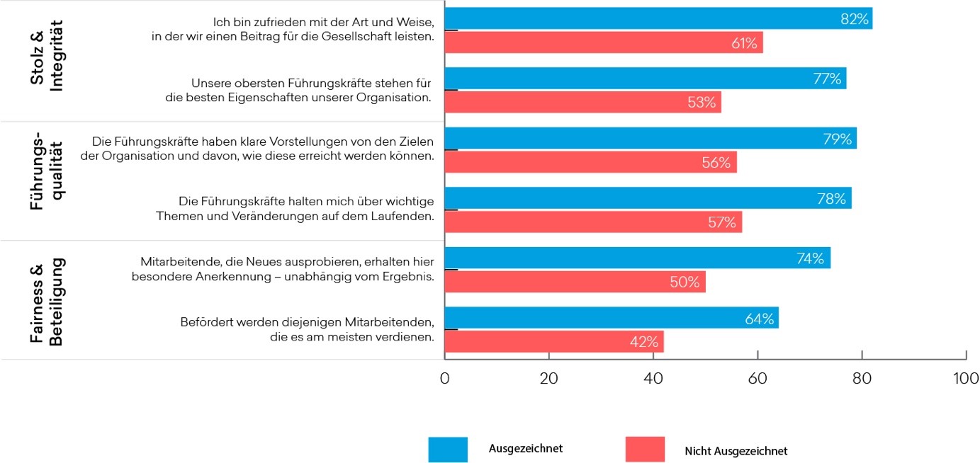 Ein grossartiger Arbeitgeber versteht es, das Potential seiner Mitarbeitenden nachhaltig zu entfalten. Die Basis dafür bietet allem voran ein hohes Mass an Vertrauen, erreicht durch gelebte Werte und Führungsqualität. Auch wenn sich diese Aspekte für die einzelnen Unternehmen individuell gestalten, lassen sich dennoch übergreifende Trends und bewährte Praktiken identifizieren. Gleichzeitig zeigt sich in der Grafik im Header, wo die grössten Unterschiede zu einem durchschnittlichen Arbeitgeber liegen.