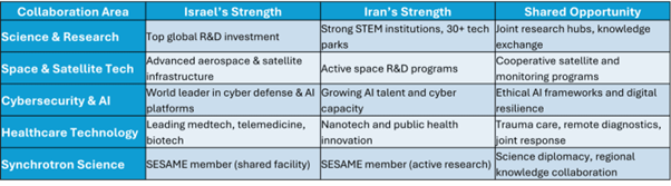 Israels Innovationsökosystem und Irans technisches Potenzial bieten Chancen für Kooperation in Wissenschaft, Gesundheitswesen, Cybersecurity, Raumfahrt und ethischer KI. Als Vorbild dient SESAME – ein gemeinsames wissenschaftliches Forschungszentrum –, das zeigt, dass Kooperation trotz Komplexität möglich ist.