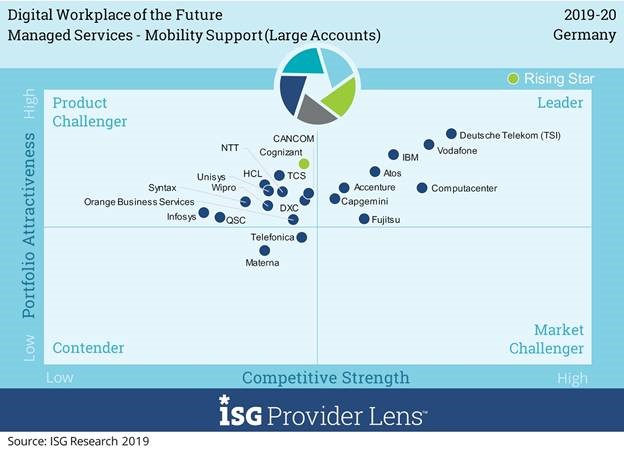 Im Marktsegment „Managed Services – Mobility Support für Großunternehmen“ untersuchte der „ISG Provider Lens™ Digital Workplace of the Future Germany 2019“ die Fähigkeiten von 22 Providern. Aktuelle Leader in diesem Markt sind Accenture, Atos, Capgemini, Computacenter, Deutsche Telekom (TSI), Fujitsu, IBM und Vodafone.