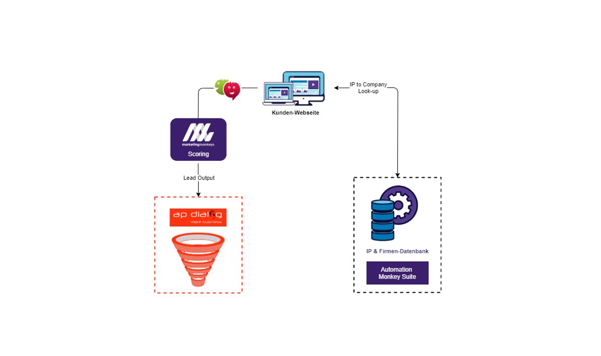 Gemeinsam wurde ein intelligentes Scoring entwickelt, welches sich in wenigen Minuten auf Kundenwebseiten integrieren lässt. Mit Hilfe des neuen IP-to-Company Moduls der Marketing Monkeys werden B2B-Kunden dem Verkaufstrichter des Call Centers zugeführt.