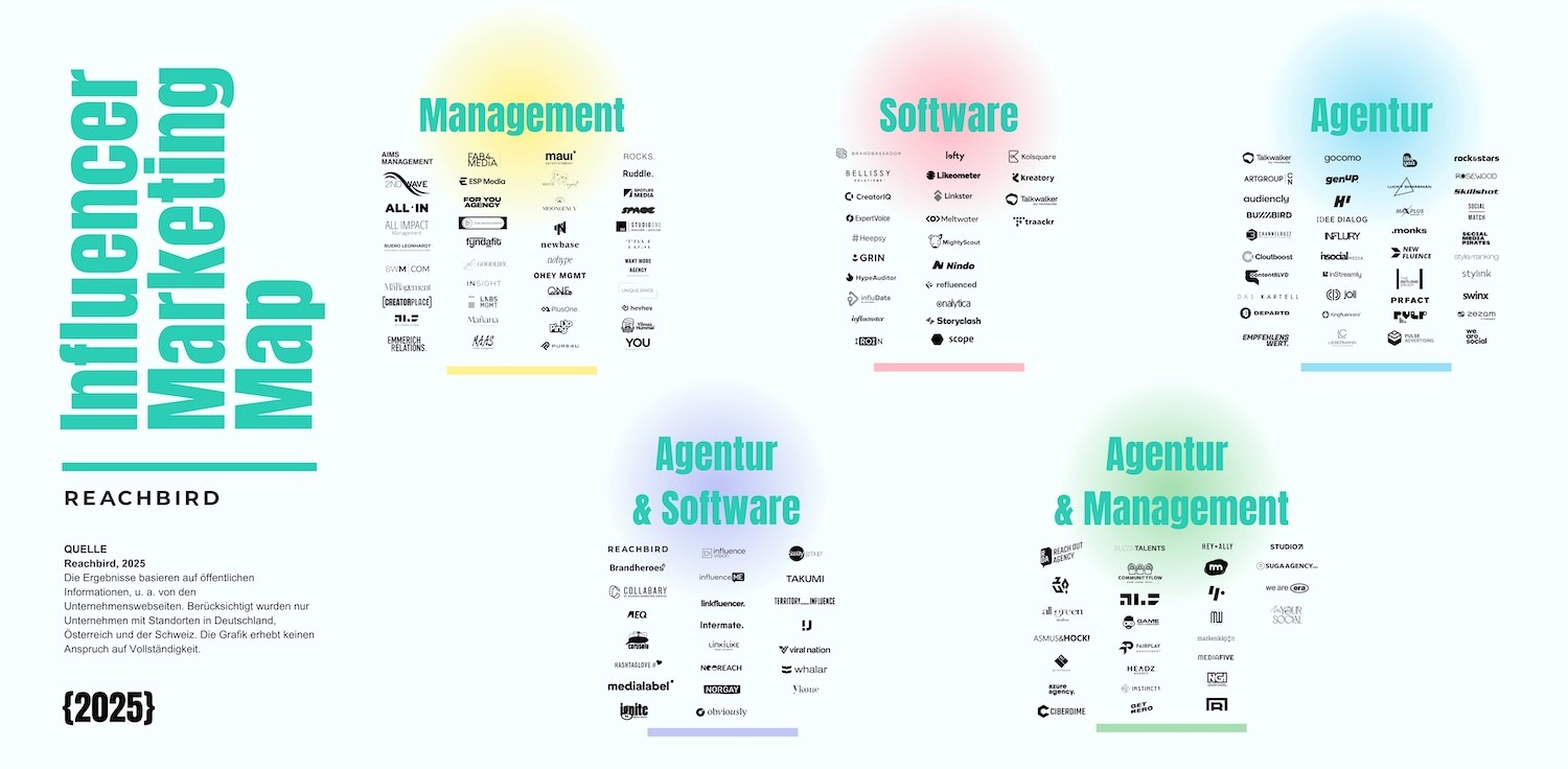 Influencer Marketing boomt – doch der Markt ist unübersichtlich. Die neue Influencer Marketing Map 2025 zeigt auf einen Blick, welche Agenturen, Tools und Dienstleister im DACH-Raum eine Rolle spielen. Die Übersicht von Reachbird strukturiert 120 Anbieter in fünf praxisnahe Kategorien und hilft Unternehmen, schneller den passenden Partner zu finden. Ob reine Agentur, Management-Plattform oder Software-Anbieter – die Map bringt Transparenz in ein dynamisches Umfeld und ist besonders für Marketingverantwortliche ein wertvolles Orientierungstool.