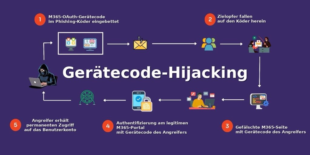 Das Opfer wird auf das legitime Microsoft-Portal «https://microsoft.com/devicelogin» weitergeleitet, um einen vom Angreifer bereitgestellten Gerätecode einzugeben. Durch die Eingabe des Codes wird das Opfer authentifiziert und ein gültiges OAuth-Zugriffstoken an die Anwendung des Angreifers ausgegeben. Mit diesem ergaunerten Token verschafft sich der Angreifer dauerhaften Zugriff auf die Microsoft 365-Konten und Unternehmensdaten des Opfers.