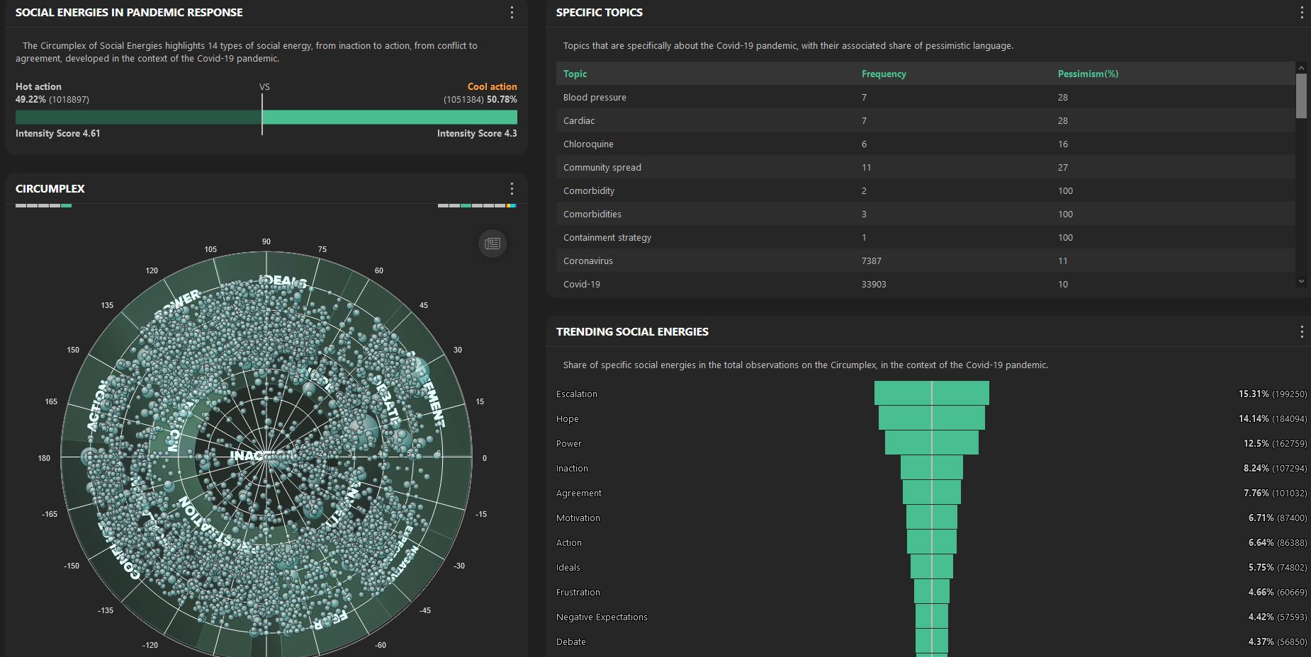 Soziale Energien als Gradmesser Im Dashboard lässt sich eine Vielzahl von kollektiven Emotionen beobachten und extrahieren – es wird veranschaulicht, wie emotionale Erfahrungen und Diskurse voneinander wegfließen und sich gegenseitig annähern. Die „Social Energy“ fasst die Technologie anhand der Daten und Messungen der letzten 24 Stunden zu Pessimismus- und Optimismus-Trends, Medienaufmerksamkeit, Maß an Sorge, Aufregung, Depression und Eskalation in Nachrichtendiskursen zusammen. So lässt sich nahezu live sagen, welche Stimmungen gerade vorherrschen. „Erste Beobachtungen zeigen, dass wider Erwarten nicht Angst und Besorgnis die vorherrschenden kollektiven Gefühle in der Pandemie sind. Stattdessen regieren Not und Eskalation aber auch Hoffnung, Machtgefühle und deren Schwankungen aber oft auch Untätigkeit und Passivität“, stellt Pollert heraus. „Eine interessante Mischung von Emotionen, die uns bei der Beurteilung der Folgen dieser Krise helfen kann.“ Zudem misst ein Ticker, wie pessimistisch die Medienberichte zu Themen sind, die direkt mit dem Umgang und der Eindämmung der Ausbreitung des Coronavirus in Zusammenhang stehen. Ergänzt wird das Dashboard um eine Darstellung der geographischen Verteilung der Fälle gemäß WHO sowie um einen Medienaufmerksamkeitsindikator, der den Umfang der Corona-bezogenen Nachrichten anzeigt. „Eine Sammlung an Use-Cases beleuchtet außerdem die Auswirkungen von Coronaindizierten Phänomenen an konkreten Beispielen“, berichtet Pollert. „Mit dem Covid-19Dashboard möchten wir einen entscheidenden Beitrag zur Erforschung dieser weltweiten Krise leisten.“