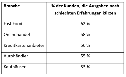 Auch die Branche spielt eine Rolle: Fast-Food-Restaurants sind am stärksten gefährdet – 62% der Kunden reduzieren oder beenden ihre Ausgaben nach einer schlechten Erfahrung. In Branchen, in denen ein Wechsel zur Konkurrenz leichtfällt, können schlechte Erfahrungen besonders teuer zu stehen kommen.