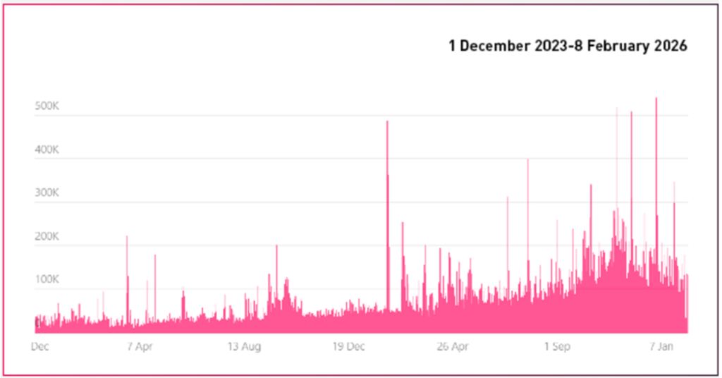 2025 wurden über 43,5 Millionen Channels und Gruppen blockiert. Die täglichen Abschaltungen stiegen von zuletzt 10.000-30.000 auf 80.000-140.000 pro Tag, mit Spitzen von über 500.000 Löschungen an einem einzigen Tag (siehe Abbildung 1).